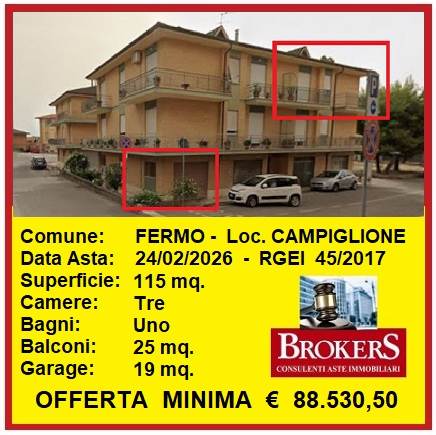 Fermo: Il Tribunale di Fermo ha disposto la vendita in asta dei diritti di piena proprietà su unità immobiliare facente parte di piccolo edificio plurifamiliare, sito in Piazza Svampa, in località Campiglione di Fermo, a poca distanza dal nuovo ospedale. L'appartamento, di grandi dimensioni e con accesso da scala comune, è posto al piano secondo, ha la superficie commerciale di mq. 140 ed è composto da ingresso, soggiorno, cucina abitabile, disimpegno notte, tre camere, un bagno e quattro balconi per mq. 25, oltre a soffitta al piano terzo e garage al piano terra di mq. 19. Discrete le condizioni di manutenzione, pavimenti in marmo e ceramica, infissi in legno.