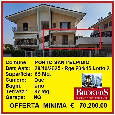 Porto Sant'Elpidio: Il Tribunale di Fermo ha disposto la vendita in asta dei diritti di piena proprietà di appartamento sito in via Monti della Laga, traversa di Via Garda, nella parte ovest del comune di Porto Sant'Elpidio, a circa un km da strada statale. L'abitazione si trova al Primo Piano di una piccola palazzina plurifamiliare e risulta libero su tre lati. L'abitazione ha una superficie di circa mq. 65 e si compone di ingresso, soggiorno con angolo cottura, disimpegno notte, due camere, un bagno, e dispone di balconi e grande terrazzo per complessivi 87 mq. La costruzione si presenta in ottime condizioni, la finitura esterna è a mattoni faccia vista, gli infissi sono con vetro termico e persiane, portone blindato, pavimenti in gres porcellanato, riscaldamento autonomo. Possibilità di acquisto di garage con altro lotto d'asta ad offerta minima di euro 8.662,50.