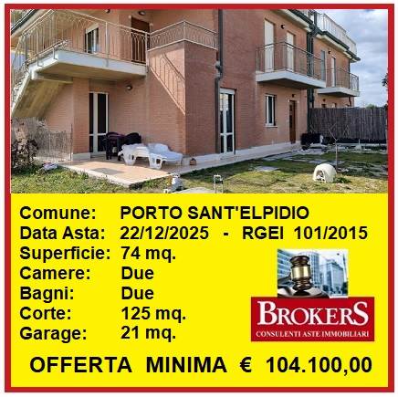 Porto Sant'Elpidio: Il Tribunale di Fermo ha disposto la vendita in asta dei diritti di piena proprietà di appartamento e garage siti in via Ravenna, in complesso residenziale affacciato sul mare, nella zona sud del comune di Porto Sant'Elpidio. La posizione è ottima per l'immediata vicinanza alla spiaggia. L’appartamento è posto al piano terra di una palazzina plurifamiliare, ha ingresso indipendente sul lato nord-est del fabbricato, è diviso in zona giorno, organizzata in ingresso-soggiorno con angolo cottura e zona notte, con disimpegno, camera con bagno privato, una cameretta e bagno comune. Dalla cameretta con una scala interna si accede al sottostante garage. L’appartamento affaccia per i due lati liberi su una corte esclusiva e recintata, di circa 125 mq. sistemata a giardino. Il garage di circa 21 mq. è situato immediatamente al di sotto dell’abitazione e da questa accessibile tramite scala in legno oltre che dall'ingresso eterno carrabile. La finitura esterna del fabbricato è a mattoni faccia vista, l'interno presenta pavimentazione in parquet, infissi in pvc con vetro-camera, porte in legno, riscaldamento autonomo.