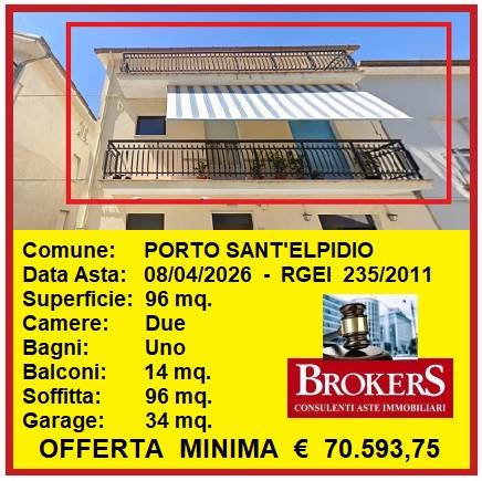 Porto Sant'Elpidio: Il Tribunale di Fermo ha disposto la vendita in asta dei diritti di piena proprietà di unità immobiliare sita in via Abruzzi, nella parte nord del comune di Porto Sant'Elpidio, a soli 500 mt. dal Mare e dalla Pineta. L'appartamento si trova al piano primo di una casa bifamiliare, ha una superficie di mq. 96 e tre balconi per mq. 14, l'accesso avviene a mezzo di scala utilizzata in modo esclusivo. L'abitazione è composta da ingresso, soggiorno, cucina-pranzo separato, due camere da letto ed un bagno. Inoltre al piano secondo si trova il sottotetto esclusivo, di cui la parte più alta utilizzata come ambiente di disbrigo e la restante allo stato grezzo, mentre nella parte posteriore dell'abitazione si trova un garage di mq. 34.