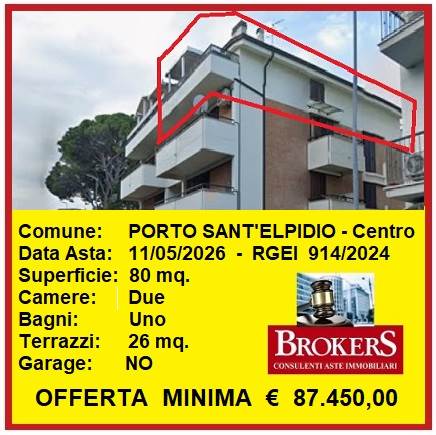 Porto Sant'Elpidio: Il Tribunale di Fermo ha disposto la vendita in asta dei diritti di piena proprietà di unità immobiliare sita in via Elpidiense, nella parte centrale del comune di Porto Sant'Elpidio, vicino ai principali servizi e ben collegato alle principali vie di comunicazione. L'appartamento si trova al terzo ed ultimo piano di un fabbricato plurifamiliare con finitura esterna in parte a mattoni faccia vista ed in parte ad intonaco tinteggiato. L'accesso avviene dal vano scala dotato di ascensore, la superficie è di circa mq. 80 ed è composto da ingresso su soggiorno con angolo cottura, piccolo disimpegno zona notte, una camera da letto matrimoniale, una cameretta/studio ed un bagno. Dal soggiorno e dalla camera da letto è possibile accedere ai terrazzi esterni posti uno ad est ed uno ad ovest di complessivi mq. 26. La pavimentazione è in parquet, in cucina è presente una pavimentazione in monocottura effetto pietra mentre nel bagno i rivestimenti e la pavimentazione sono in gres porcellanato. Discreto lo stato di manutenzione con buone finiture e dotato di tutti gli impianti a norma. Gli infissi esterni sono in legno con doppio vetro così come le persiane che risultano essere scorrevoli.