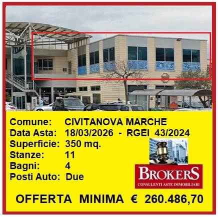 Civitanova Marche: Il Tribunale di Macerata ha disposto la vendita per i diritti di piena proprietà su unità immobiliare ad uso UFFICIO, sita a Civitanova Marche in Via Silvio Zavatti, nella zona sud del comune ed a circa 300 mt. dal mare. Il fabbricato dove è ubicato l'immobile ha destinazione commerciale al piano terra e direzionale al piano primo, con ampia corte circostante adibita a parcheggio. L'ufficio è posto al piano primo, ha una superficie di mq. 350, accessibile da scala esterna in acciaio ed ascensore, usufruisce di doppio ingresso, uno dal ballatoio esterno ed uno interno dal corridoio centrale. Dall'ampio ingresso si accede al disimpegno che distribuisce 10 stanze adibite ad uffici, due blocchi di doppi servizi igienici ed una grande sala riunioni e conferenze di circa 70 mq. accessibile anche dal secondo ingresso in maniera autonoma. Ottime rifiniture, pavimenti in gres porcellanato, impiantistica cablata, infissi in alluminio con doppi vetri, riscaldamento e raffrescamento a pompa di calore, pareti divisorie in strutture da arredo, in parte dotate di vetrate. Nella vendita sono compresi anche due poti auto esclusivi. Ottima opportunità di investimento, con possibilità anche di frazionamento in due unità separate.