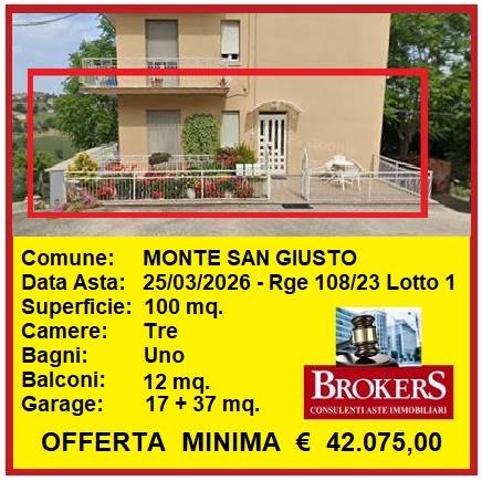 Monte San Giusto: Il Tribunale di Macerata ha disposto la vendita per i diritti di piena proprietà su unità abitativa sita a Monte San Giusto in Via Valle, zona semiperiferica ma adiacente il centro del paese. L’appartamento è posto al piano terra di un edificio plurifamiliare di tre piani, con finitura esterna ad intonaco tinteggiato ed accesso da scala comune. L'abitazione ha una superficie di circa mq. 100, si compone di ingresso, sala da pranzo con angolo cottura, tre camere ed un bagno, oltre a due balconi per mq. 12 e due garage al piano seminterrato rispettivamente di 17 e 37 mq. Buono lo stato generale di conservazione.