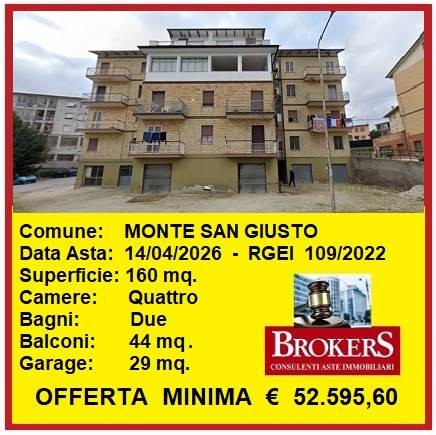 Monte San Giusto: Il Tribunale di Macerata ha disposto la vendita per i diritti di piena proprietà su unità abitativa sita a Monte San Giusto in Via Luigi Longo, in posizione adiacente il centro del paese. L'appartamento è posto al terzo piano di un edificio plurifamiliare con finitura esterna a mattoni faccia vista, con accesso da scala comune priva di ascensore. L'abitazione ha dimensione di mq. 160 e si compone di ingresso, soggiorno, grande cucina con accesso al terrazzo di mq. 32, zona notte con quattro camere e due bagni, due balconi per mq. 12. Al piano superiore si trova la soffitta di mq. 27 ed al piano terra il garage di mq. 29. Finiture interne in buone condizioni, pavimenti zona giorno in piastrelle, zona notte in parquet, bagni in ceramica, porte in legno, infissi in legno con vetro singolo e tapparelle in pvc, controfinestre esterne in alluminio, impianti autonomi.