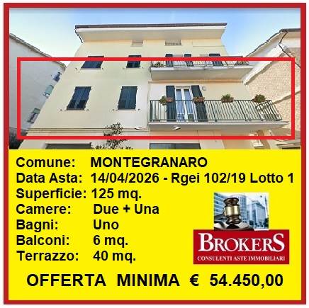 Montegranaro: Il Tribunale di Fermo ha disposto la vendita in asta dei diritti di piena proprietà di una unità immobiliare facente parte di un piccolo fabbricato bifamiliare sito a Montegranaro in Via Alessandro Manzoni, costituita da appartamento al piano primo, della superficie di mq. 125, composto da ingresso, soggiorno, cucina-pranzo, due camere, una cameretta, un bagno, un balcone di mq. 6 ed un terrazzo di mq. 40. Libero su quattro lati ed in buone condizioni di manutenzione, pavimenti in parquet, porte in legno, infissi in pvc, impianti autonomi.