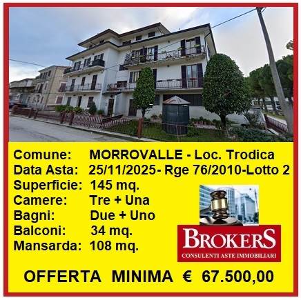 Morrovalle: Il Tribunale di Macerata ha disposto la vendita in asta per i diritti di piena proprietà sue DUE abitazioni site a Morrovalle, località Trodica in via XXIX Giugno, composte da un appartamento al piano primo ed un appartamento mansardato al piano terzo. L'abitazione al piano primo ha una superficie di 145 mq. ed è composta da ingresso, sala da pranzo con retrocucina, grande salone, tre camere matrimoniali, due bagni e due balconi per 34 mq. La mansarda di mq. 108 è composta da ingresso nell'ampio salone doppio, una cucina, una camera, un bagno ed un ripostiglio.