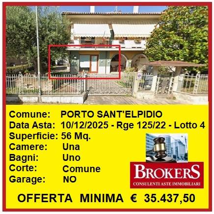 Porto Sant'Elpidio: Il Tribunale di Fermo ha disposto la vendita in asta dei diritti di piena proprietà di appartamento posto al piano terra di edificio familiare, sito in Via Solferino, nella parte centro-sud di Porto Sant'Elpidio a circa 400 mt. dal mare. L'abitazione ha ingresso indipendente dalla corte esterna, ha una superficie di circa 56 mq. ed è composta da ingresso in unico ambiente soggiorno-pranzo-cottura, disimpegno notte, camera matrimoniale e bagno. Ottime condizioni di manutenzione, infissi con vetri termici, pavimenti in parquet laminato, riscaldamento autonomo a radiatori.