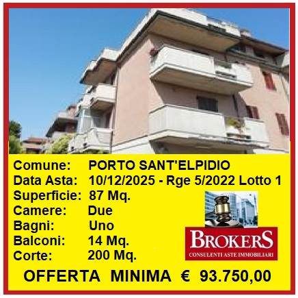 Porto Sant'Elpidio: Il Tribunale di Fermo ha disposto la vendita in asta dei diritti di piena proprietà di appartamento sito in via Ungheria, nella parte nord del comune di Porto Sant'Elpidio. L'abitazione si trova al primo piano di una palazzina con esterno rifinito a mattoni faccia vista ed ha esposizione verso sud. La superficie è di mq. 87 circa e si compone di ampio soggiorno con angolo cottura, disimpegno notte, due camere ed un bagno, oltre a balconi per mq. 14. Completa la proprietà un'ampia porzione di corte esterna. Pavimenti in ceramica, pareti intonacate e tinteggiate, finestre in legno con vetro termico e persiane, porte in legno. Discrete condizioni di manutenzione.