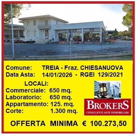 Treia: Il Tribunale di Macerata ha disposto la vendita per i diritti di Piena Proprietà SUPERFICIARIA di compendio commerciale, artigianale e residenziale sito nel comune di Treia in Via Genova, nella Frazione Chiesanuova. L'intero immobile è composto da un locale di circa 650 mq. con destinazione artigianale posto al piano seminterrato, da altro locale di circa 650 mq. con destinazione commerciale ed uffici posto al piano terra e da un appartamento sito al piano primo di circa 125 mq. allo stato grezzo. Corte esterna di circa 1.300 mq. con piazzale espositivo completamente recintata. Si precisa che oggetto di vendita è il Diritto di Superficie per 99 anni a partire dal 1983, rinnovabili di ugual periodo.